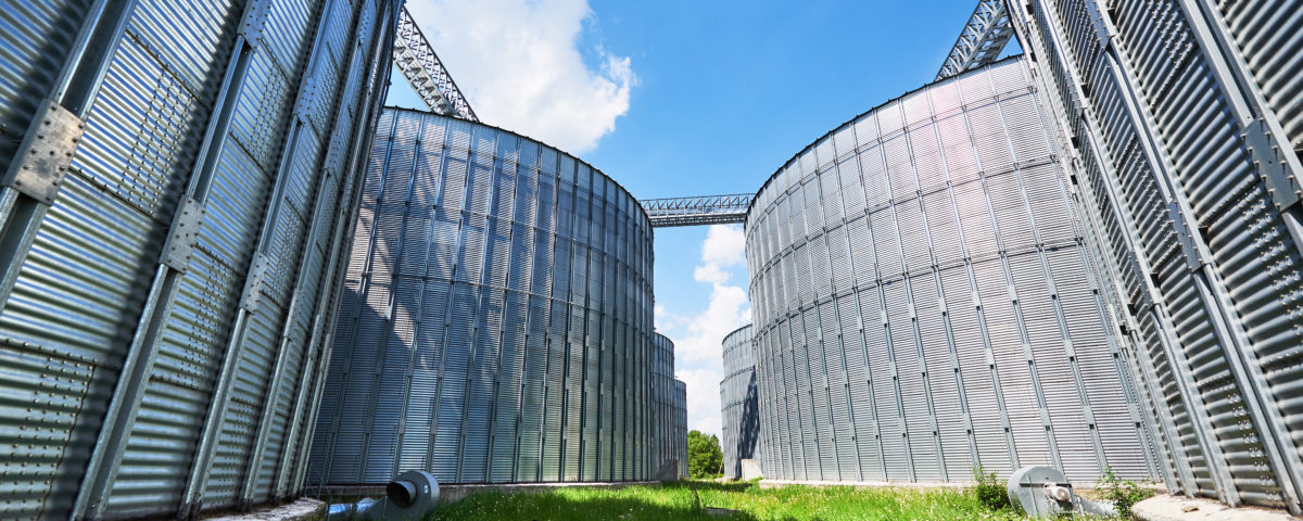 Agricultural Silos. Building Exterior. Storage and drying of grains, wheat, corn, soy, sunflower against the blue sky with white clouds.